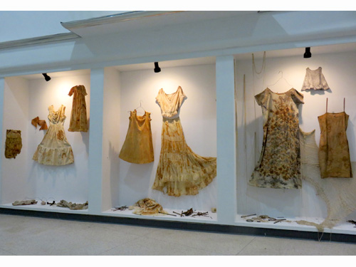 Rusted vintage garments as shown at Art from the Ashes, an invitational exhibit commemoratingthe sesquicentennial of Gen. Sherman's burning of Columbia, 2015